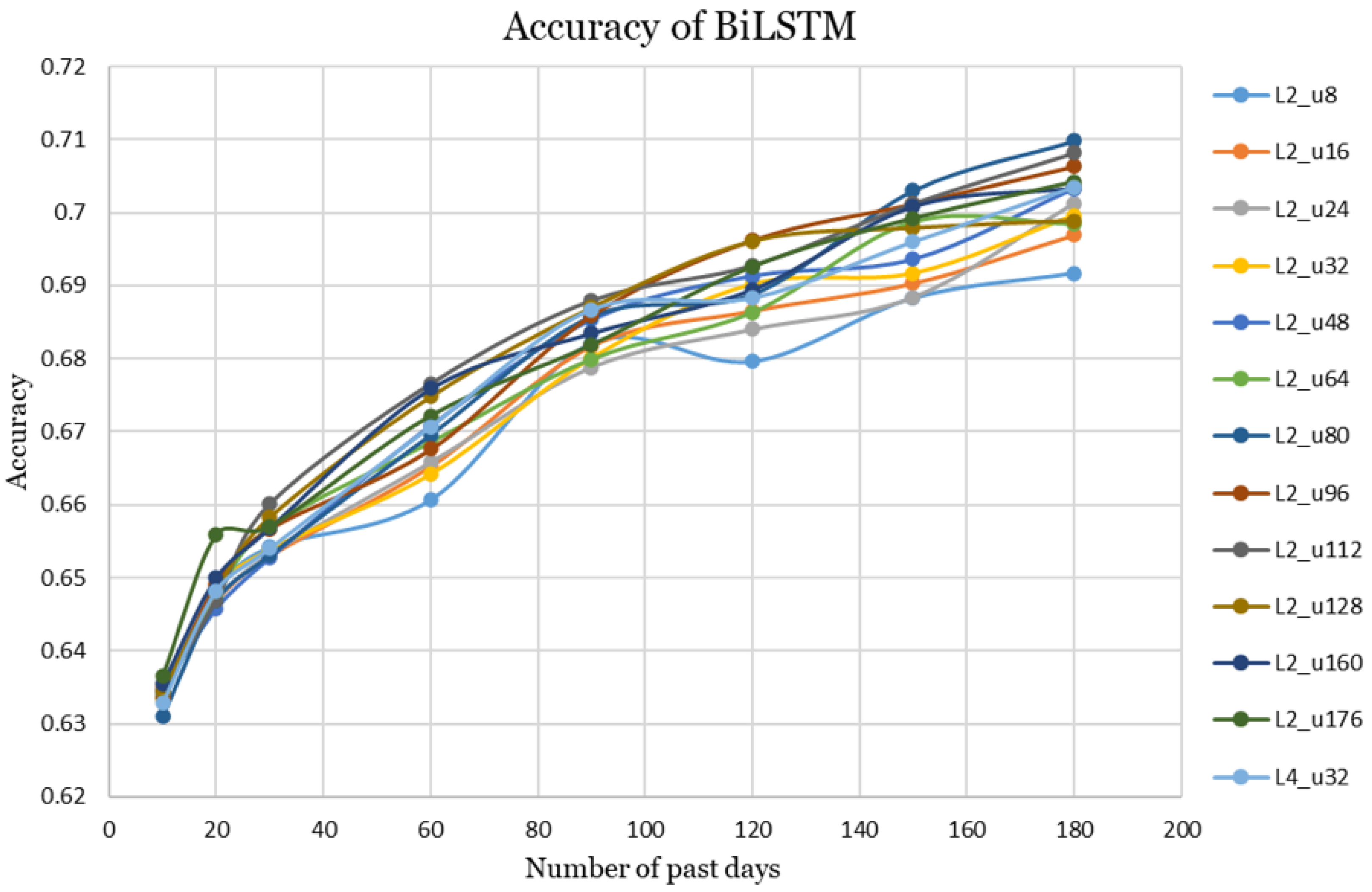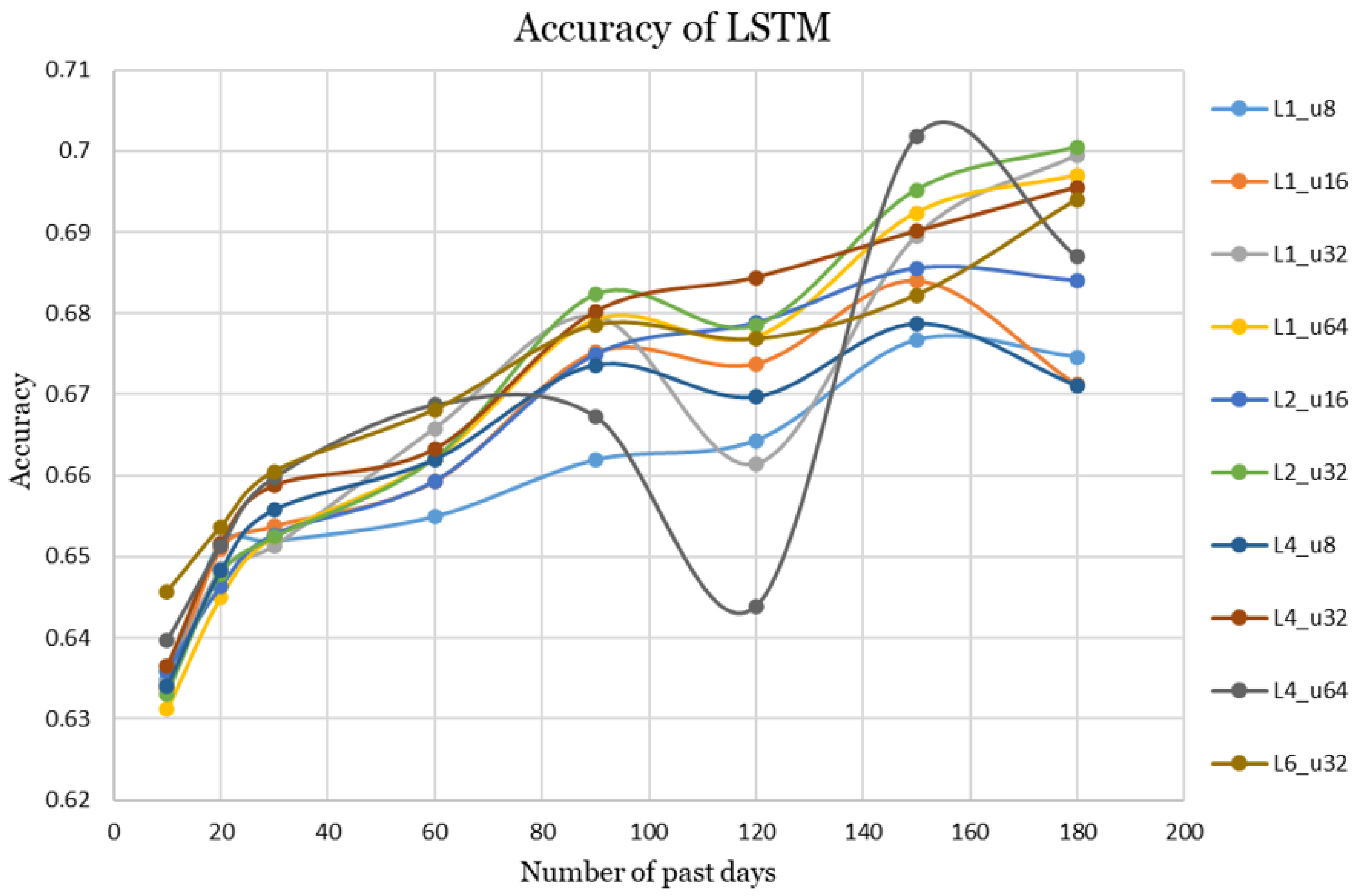 Figure 5. The figure shows how accuracy generally increases with longer historical windows but varies by number of layers and number of units per layer. As illustrated, an accuracy of approximately 0.63 was achieved using a 10-day historical window. As the window size gradually increased up to 180 days, a general upward trend in accuracy was observed. The performance of the LSTM architecture is notably influenced by the number of layers and units, which leads to distinct characteristics in the resulting accuracy curves. The configuration with four layers and 64 units per layer achieved the highest accuracy of 0.7018; however, the corresponding curve exhibited a substantial drop around the 120-day mark, indicating potential instability. To reduce the impact of such an instability and to evaluate overall performance across varying historical window sizes, the average accuracy was calculated. The LSTM configuration with four layers, each containing 32 units, achieved the best accuracy,