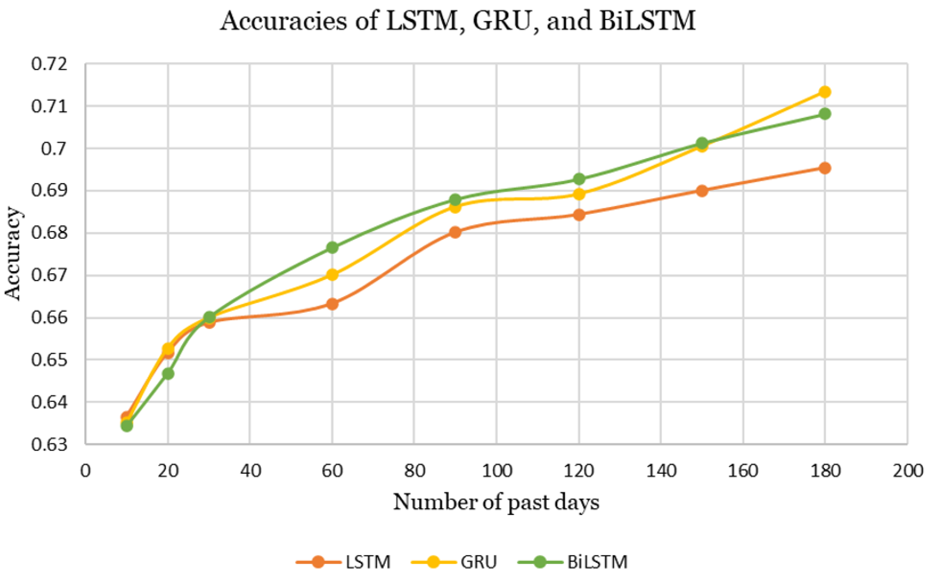 Table 5. Based on these metrics, BiLSTM slightly outperformed the other models in terms of accuracy across varying number of past training days.