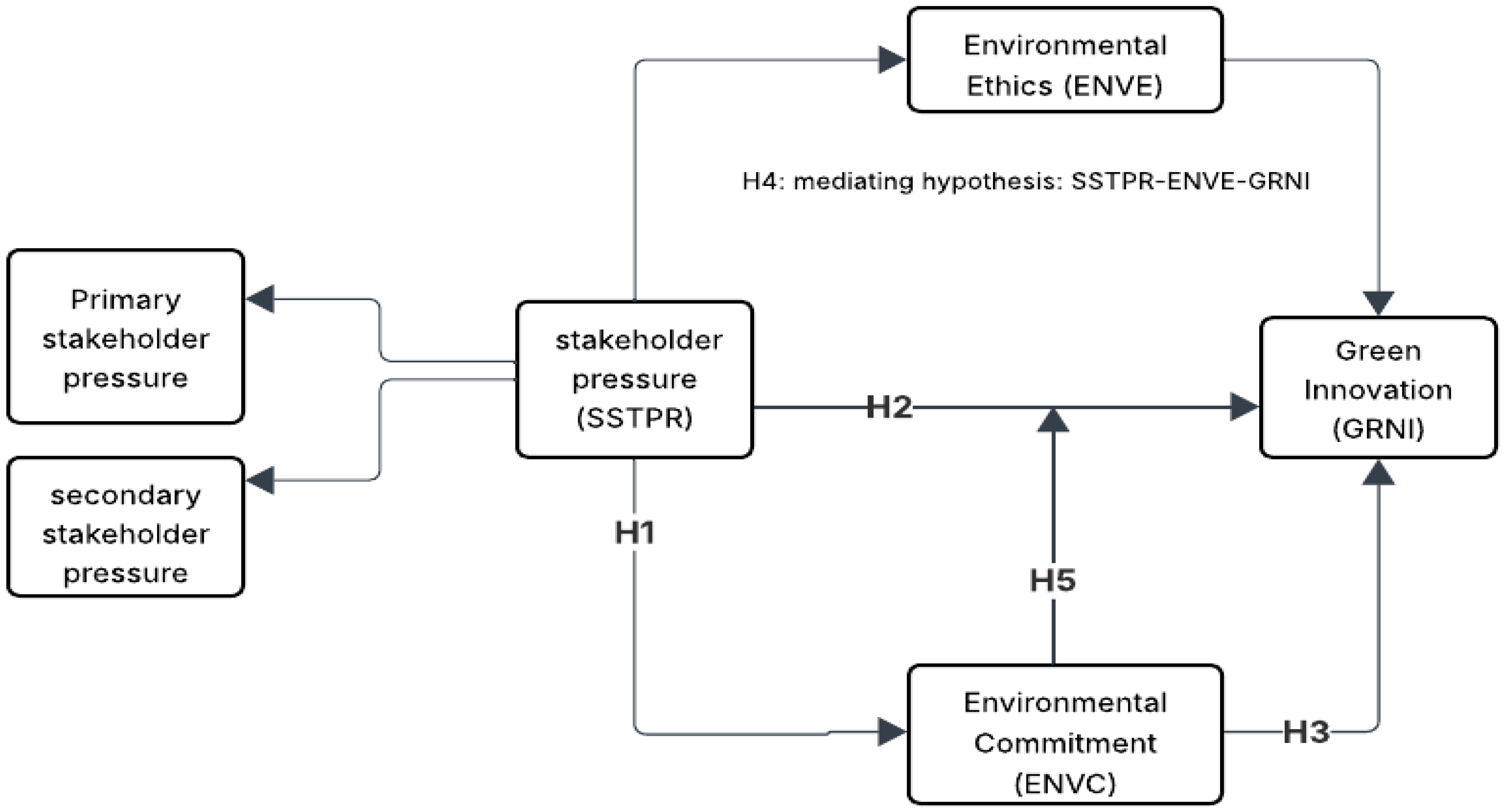 p-value = 0.654), though their relationship is not significant, which does not support the hypothesis, suggesting that firms may not respond to secondary stakeholders unless strongly committed to environmental values. This divergence from Western contexts, where NGOs and media often directly shape firm behavior, emphasizes the contextual role of institutional strength and societal awareness. In weakly institutionalized environments like Bangladesh, secondary stakeholders’ signals may lack enforcement power, and resource-constrained SMEs are likely to prioritize pressures that have immediate strategic or economic consequences. This underscores the need for comparative research across institutional contexts to examine how the relative influence of secondary stakeholders varies between strong and weak institutional environments, and how ENVC interacts with these pressures under differing cultural, regulatory, and resource conditions.