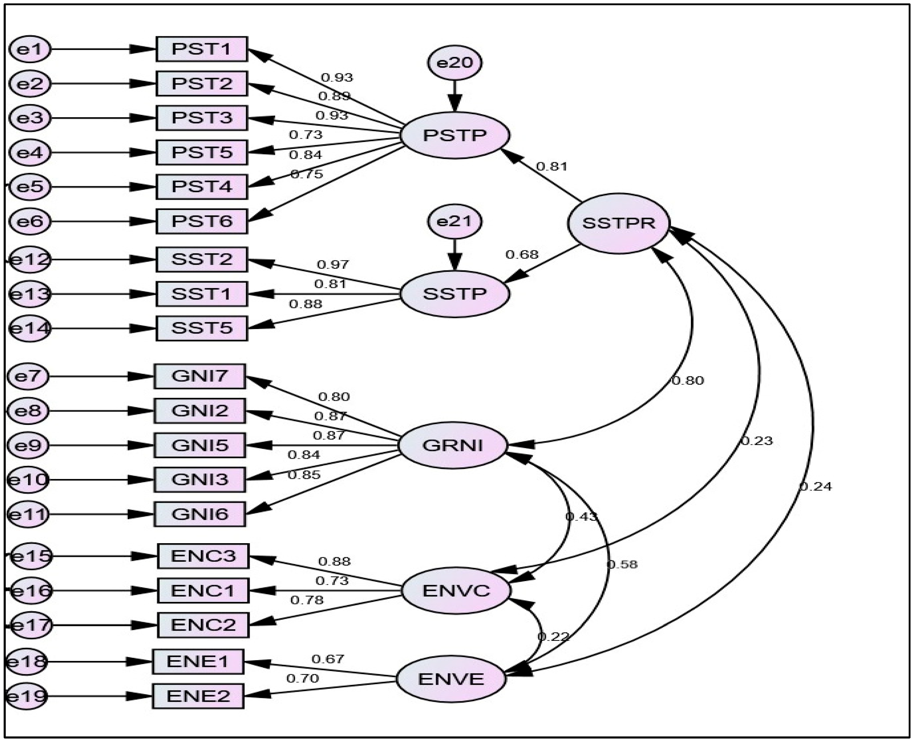 Table 2 reflects a 2-dimensional solution with 9 items. To ensure the model’s authenticity and robustness, the reliability, validity, and CFA were estimated to represent the constructs by taking SSTPR as a second-order construct. Due to poor loadings of the regression weight, 2 items from ENVC and 3 items from ENVE had to drop out, which was employed as a theory-consistent purification step to enhance measurement precision while preserving the conceptual integrity of the ENVC and ENVE constructs.