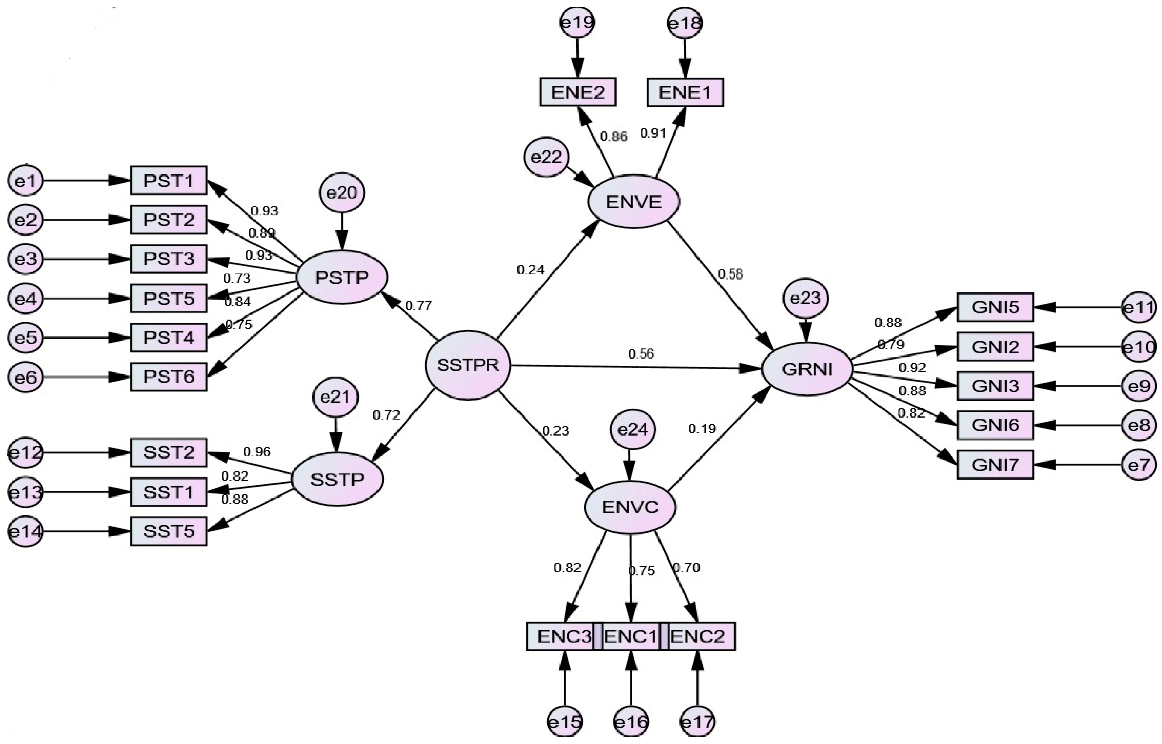 H4 states that ENVE is the mediating variable between SSTPR and GRNI, which was also supported in examining the mediating role of ENVE. At first, this study examined the indirect effect of SSTPR on GRNI through ENVE, and it exhibits a significant effect with a β value of 0.142. Then, the direct effect of SSTPR on GRNI was also examined after removing ENVE as a mediator and found a significant positive impact with a β value of 0.597 (