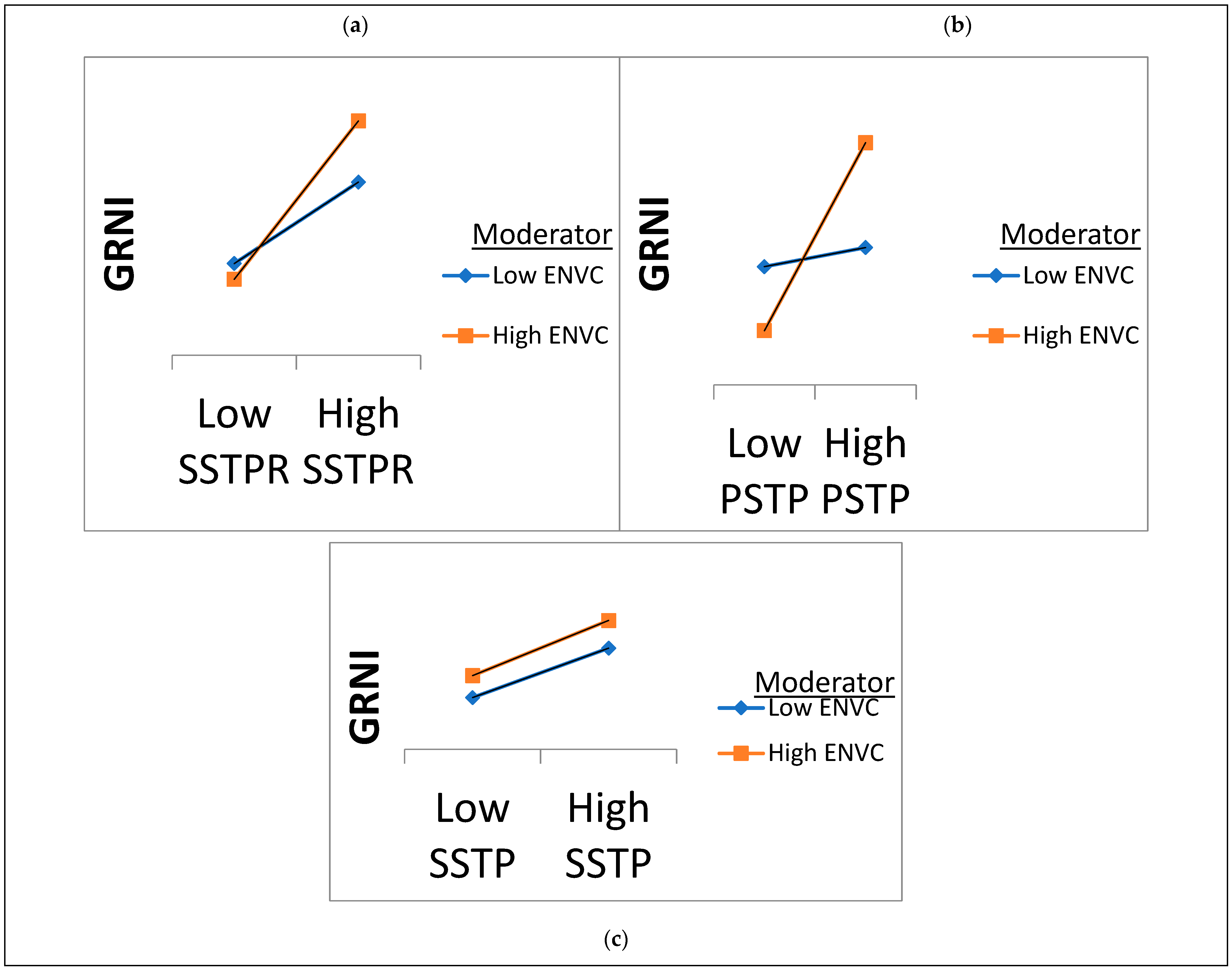 Appendix A also illustrates the moderating effect of ENVC on SSTPR and GRNI (H5), on PSTP and GRNI (H5a), and SSTP and GRNI (H5b). H5 suggests that the influence of SSTPR on GRNI is moderated by ENVC, which asserts that the higher appearance of ENVC strengthens the positive influence of SSTPR on GRNI, whereas the lower appearance of ENVC weakens the positive influence of SSTPR on GRNI (Model 5, β = 0.158, t-value = 2.132,
