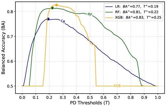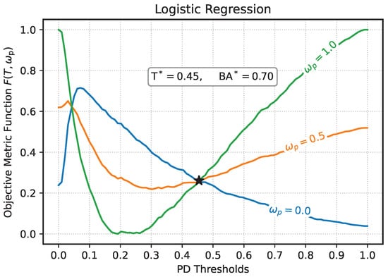 In conventional PD modeling, the decision threshold used to classify observations as default or non-default is typically fixed at a default value, denoted by . A common choice is , corresponding to the point where the predicted PD exceeds 50%. This convention implicitly assumes symmetric mis-classification costs and balanced class distributions, conditions that rarely hold in real-world credit risk applications, where default events are relatively rare. As a result, may not provide an optimal balance between model performance and fairness. Moreover, biases across protected groups can further exacerbate disparities, as a fixed threshold may disproportionately affect certain subpopulations.