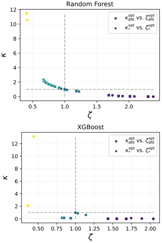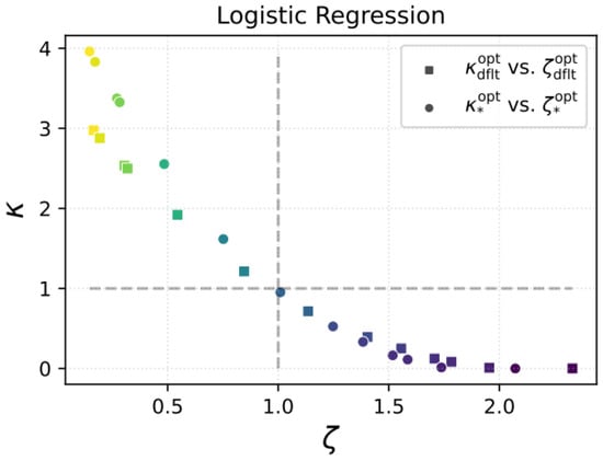 Third, to better understand the effect of optimized thresholds (Equation (15)), we introduce a dual-reference comparison strategy relative to both the default threshold and the minimax-optimal threshold (Equation (13)). We further develop a diagnostic ratio-based visualization () (Equations (16)–(18)) in quadrant form to evaluate fairness–performance gains, providing intuitive support for threshold selection in operational settings.