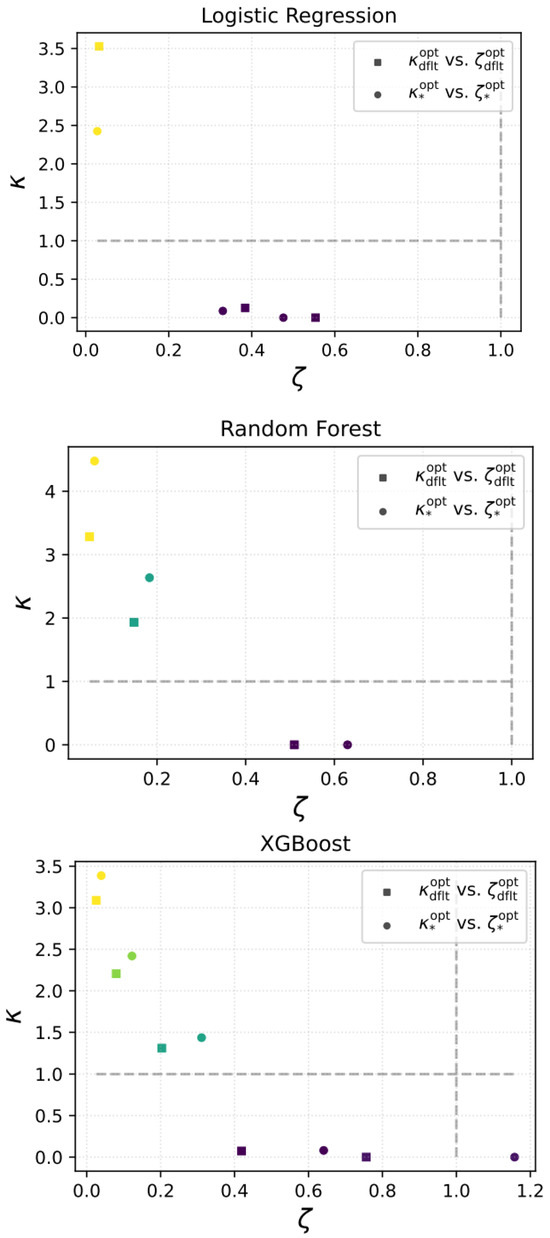 The goal is to identify the threshold that minimizes F, while ensuring that the result is robust to variations in . The optimal threshold balances performance and fairness, aligning with the desired objectives of the loan decision-making process. As such, they are indicative of how each model balances the trade-off between predictive accuracy and fairness in the context of the loan decision-making process. The approach described in this section is effective in achieving the goal of simultaneously minimizing the maximum weighted deviation in the metrics functions from their ideal values.
