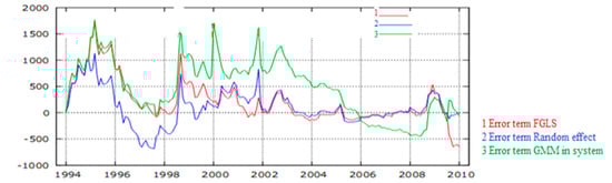 Results highlighted the existence of negative error terms for the three models calculated based on the average of the used panel data (Table 3. This result confirms the existence of a moral hazard. Previous results (Noy, 2008) based on the analysis of the period from 1995 to 2000 did not reveal the existence of moral hazard based on the absence of expected sign of the error terms (found positive). Therefore, our results do not corroborate those of Noy (2008) for this period, insofar as the estimation methods used resulted in negative error terms following bailout events (e.g., error terms following the FGLS model 1997(8)–1998(4), a period marked by the recurrence of Bailout events). H1 is thus accepted.
