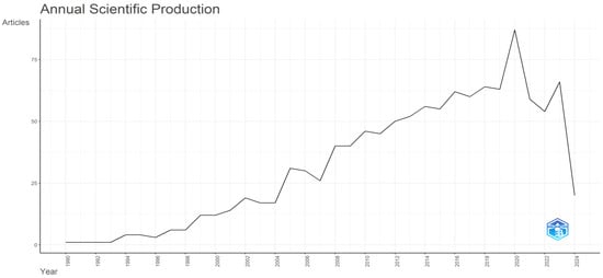 Table 2 offers details concerning the database for the period from 1990 to 2024, including 1124 references from 352 origins, such as journals and books. The average age of the documents is 10.1 years, indicating that the majority of the documents are relatively recent. The table gives an overview of the document content, including 771 additional keywords (ID) and 1960 author keywords (DE) listed. These terms aid scholars in recognizing and also classifying the subjects addressed in the database. Furthermore, the database incorporates 1860 contributors, of which 373 wrote documents as single authors, suggesting that most documents result from collaborations among several writers. The table also offers an overview of collaborative authorship within the database. In particular, it suggests that 419 articles were written by a single author, while the remaining documents had an average of 1.19 co-authors per document. Furthermore, the database had a relatively high percentage (25.98%) of international co-authors, indicating the frequency of collaboration among different countries and regions within the database.