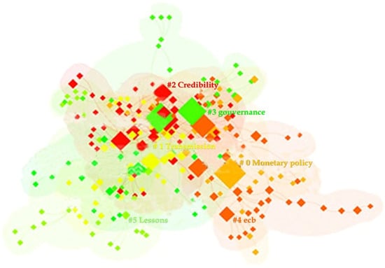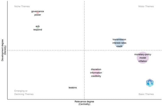 The previous figure illustrates the formation of six distinct clusters. Cluster 0 is centered on the topic of monetary policy, specifically focusing on issues related to inflation targeting and price stability. Cluster 1 is dominated by the theme of transmission, which also links to Cluster 2 through the concept of credibility. Cluster 3 is primarily concerned with governance, encompassing topics related to performance, management, and authority. Cluster 4 revolves around the European Central Bank (ECB) and its responses. Finally, Cluster 5 is focused on key lessons learned. In Figure 4, we have a cartographic representation of themes, arranged on a plane with the centrality axis on the abscissa and the density axis ordinate. By analyzing this graph, we will be able to identify the main subject, the fundamental or cross-sectional topic, the new or disappearing topics, and the niche themes.