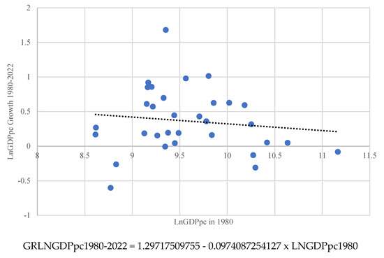 During the period from 1980 to 2022, an inverse relationship was observed between the growth rate of the logarithm of GDP per capita and the logarithm of per capita GDP of the countries in the region, relative to the reference year 1980. The convergence parameter in this period had a value of −0.0974, indicating a speed of convergence at 9.7%. Thus, during this period, the less developed economies of LAC tended to approach the more developed ones. A dynamic of convergence is evident in the region during the 1980–2022 period (see Figure 1).