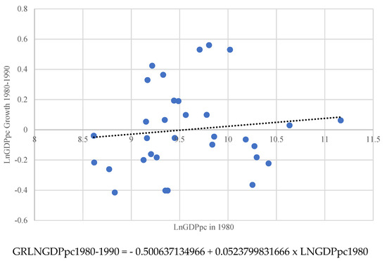 In the 1980–1990 sub-period, a positive association was observed between the growth rate of the logarithm of GDP per capita and the logarithm of GDP per capita of the economies in the region, relative to the reference year 1980. The convergence parameter was 0.0523, indicating a divergence speed of 5.2% among LAC countries (see Figure 2).