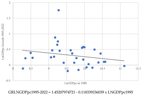 Through the 1995–2022 sub-period, a negative relationship was observed between the growth rate of the logarithm of GDP per capita and the logarithm of per capita GDP of LAC economies, relative to the reference year 1995. Within this period, the convergence parameter stood at −0.1183, indicating a speed of convergence at 11.8% among the countries of LAC (see Figure 3).