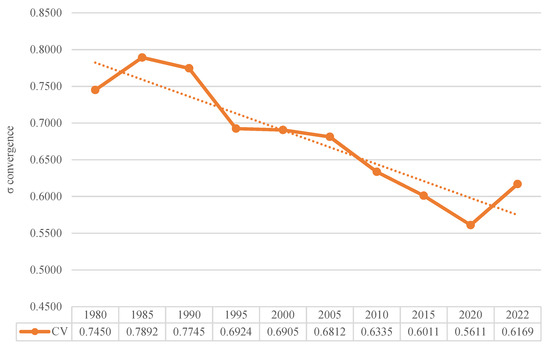 The sub-period analysis reveals that countries tended to converge between them, in terms of per capita income between 1995 and 2022. This is evidenced by a 10.9% decrease in the CV during these years, indicating σ convergence. In contrast, during the 1980–1990 sub-period, the CV increased by 3.9%, denoting σ divergence (see Table A5).