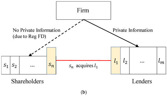 Shareholder–lender merger and private information flow. Before the merger takes place, neither the shareholder nor the lender involved in the M&A transaction holds both equity and debt of the firm. Because Regulation FD applies to shareholders but not lenders, the acquiring shareholder () gains access to the firm-specific private information held by the lender () after the merger transaction, and the flow of private information leads to an increase in information asymmetry among shareholders. (a) Information held by shareholders and lenders before shareholder–lender merger. (b) Information held by shareholders and lenders after shareholder–lender merger.