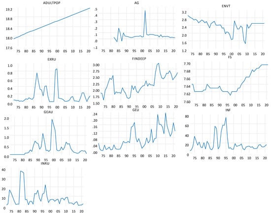 Kurtosis, which gauges the concentration of data around the mean, has a normal distribution value of 3. A high kurtosis value indicates that the data are heavily concentrated in the tails, leading to fatter tails and more-extreme values. The kurtosis of ADULTPOP (1.836), FS (2.175), FINDEEP (2.359), and GEU (2.798), suggests a distribution that is less concentrated in the tails compared to a normal distribution, indicating a relatively moderate presence of extreme values. The kurtosis value for ENVT (4.229) indicates a distribution with a higher concentration of data points in the tails, leading to more extreme values. Similarly, the kurtosis values for INF (5.949), EXRU (6.811), GEAU (7.665), and INRU (7.316) reflect distributions with greater concentration in the tails, resulting in fatter tails and more extreme values. The Jarque–Bera test statistics for GEAU (83.699), EXRU (67.316), INF (49.350), and INRU (76.239), with p-values of 0.000, as well as for ENVT (14.697) with a p-value of 0.001, all indicate that these distributions significantly deviate from normality. GEU (6.044) and FS (7.041), and the probability values of 0.049 and 0.030, respectively, suggests that the distribution deviates from a normal distribution at a significance level of 0.05. The kurtosis values for ADULTPOP (2.823) and FINDEEP (1.857), with corresponding probability values of 0.244 and 0.395, respectively, suggest that the distributions for ADULTPOP and FINDEEP do not significantly deviate from normality.