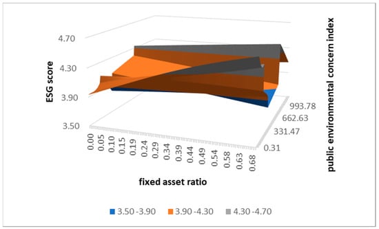 The effect of PEC on a corporation’s ESG performance remains robust when the proportion of independent directors varies, and the impact is more pronounced when this proportion is relatively low. Additionally, holding the PEC index value constant, Figure 5 shows that the curve depicting the relationship between the proportion of independent directors and the firm’s ESG performance does not exhibit clear patterns when public curiosity in the firm is low (PEC index below 370). However, at medium to high levels of public concern, a larger proportion of independent directors significantly enhances corporate ESG performance.