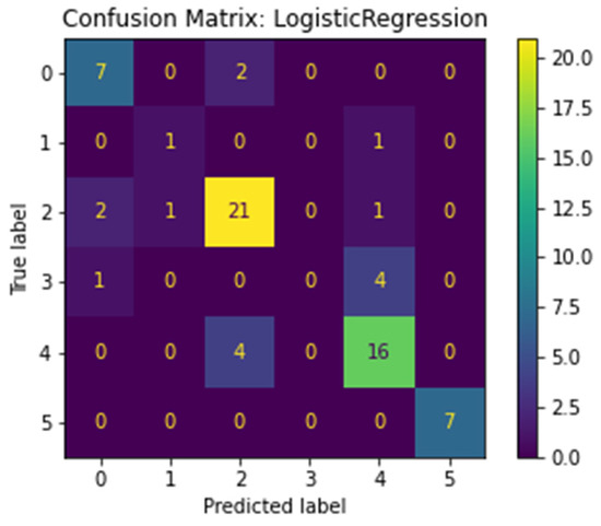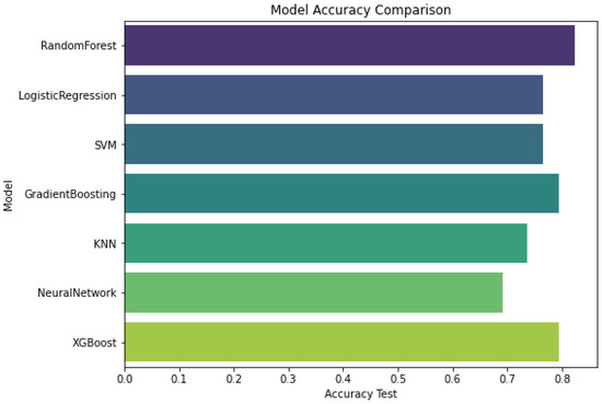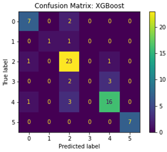 The bar plot in Figure 2 compares the relative accuracy of each model, based on the accuracy test values obtained for the testing dataset. Similarly, a confusion matrix for each model, as is evident in Figure 3, Figure 4, Figure 5, Figure 6, Figure 7, Figure 8 and Figure 9, was used to assess the performance of the classification models. The confusion matrix helped to assess how well each model was able to predict the target classes. It shows the number of true positives, false positives, true negatives, and false negatives for each class. A high sum of the diagonal elements indicates better performance because it indicates the number of accurate classifications. The sum of the diagonal elements divided by the total number of cases essentially indicates the level of accuracy. Based on this, random forest, gradient boosting, and XGBoost were further validated as having high classification performance.