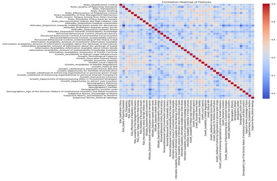 The process of coding effectively began with the importation of libraries. The libraries afforded the implements for data handling (Pandas), machine learning (Scikit-Learn, XGBoost), and data visualisation (Matplotlib, Seaborn). Each tool was then selected for its suitability in handling specific aspects of data pre-processing, training, and evaluation. This was followed by the setting of constants. Setting the random state = 42 ensured reproducibility. The number “42” is often adopted as a rule of thumb because it references The Hitchhiker’s Guide to the Galaxy, where 42 is considered the ‘hack to life’s ultimate question’. It must be explained that while any integer may be adopted, setting a fixed value ensures the consistency of results across multiple runs. After this, the code obtained data from Excel files, cleaned the column names by removing white spaces, and manipulated missing values by filling them with the mean for each column in order to achieve data consistency. This was followed by the definition of constructs, underpinned by different indicators, in order to make the feature engineering more systematic. The constructs thus defined for the study were risks, attitudes, perceived behavioural control, information availability, growth, demographics, and subjective norm. The ensuing feature engineering allowed for the creation of new columns by combining indicators under each construct, facilitating seamless analysis through the logical organisation of features. Next, features were selected based on domain knowledge (manual) and automated extraction from constructs. This combined method afforded the retainment of key features and relevant variables.