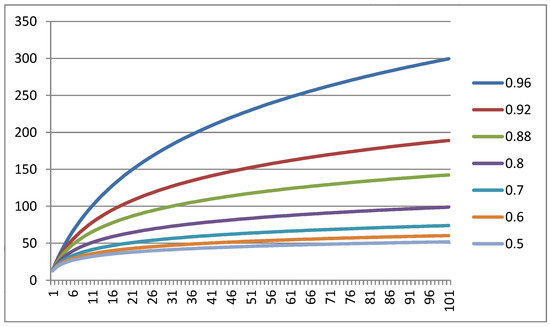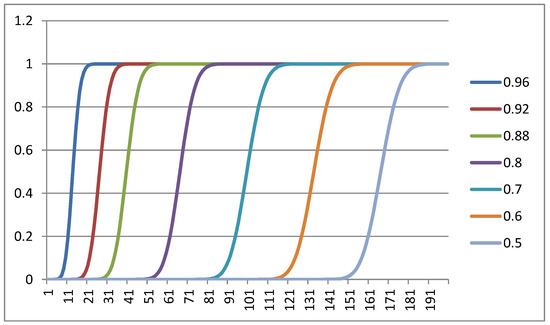 The number of days one needs to eradicate the disease with a probability depends on the number of newly infected individuals for a given reproduction number. To provide a visual representation of this fact, we display, in Figure 3, the respective curves for , and . The vertical axis shows the number of newly infected individuals and the horizontal axis shows the number of days needed until eradication. It is important to note that, in this figure, stronger social distancing dramatically reduces the time needed to eradicate the disease.