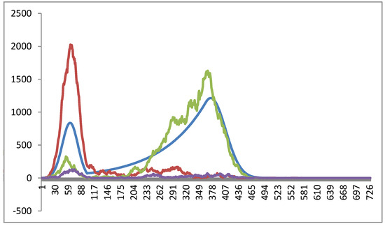 Let us assume, before time , a parameter setting like the one just discussed. However, we assume, after , that social distancing is only implemented in a way that yields a reproductive number of , which is slightly above . This may easily happen when social distancing is relaxed too much. In Figure 7, we show the path of the expected value (in blue) and three likely paths for the number of newly infected individuals. For the first 102 days, these paths show a similar random behaviour to those in Figure 6. However, for the remaining time, we see, among the three simulated paths, one with a significant upward excursion (in green) of the number of newly infected individuals. Like the expected number (in blue), this excursion starts to decrease at around because the proportion of susceptibles at that time has increased to a level where the product of the number of susceptibles and the reproductive number became less than , causing the visible decline. This indicates that, already, rather small deviations from for the product of the reproductive number and the number of susceptibles can lead to significant random upward excursions.