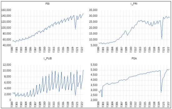 The sample is composed of 368 observations in total, covering the aforementioned period of 2000–2023, collecting data on a quarterly basis. Thus, 92 observations were collected for each of the variables analyzed, from the statistics of the Central Reserve Bank of Peru (BCRP) (set of data collected on the variables analyzed (GDP, investment in private and public infrastructure and economically active population—EAP) in the period 2000–2023). This approach allowed us to explore the relationship between infrastructure investment and economic growth while maintaining a more direct and specific analysis in its investigation.