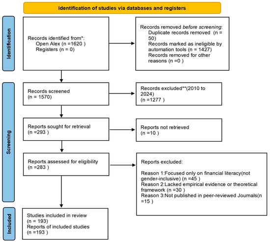 The first stage involved an exhaustive search across multiple databases, including “Open Alex”, “Scopus”, and “Web of Science” as well as academic repositories and peer-reviewed journals, to identify studies related to gender and financial literacy in developing countries. The search was conducted on August 2024. Specific keywords and search strings were used, such as variations of the terms “gender”, “financial literacy”, and “developing countries” combined with Boolean operators (“AND”, “OR”). Filters were applied to include studies published between 2010 and 2024, in English, and in peer-reviewed journals. This search resulted in the identification of 1620 records, providing an extensive pool of studies to assess.