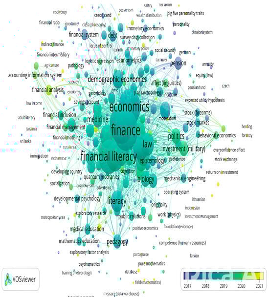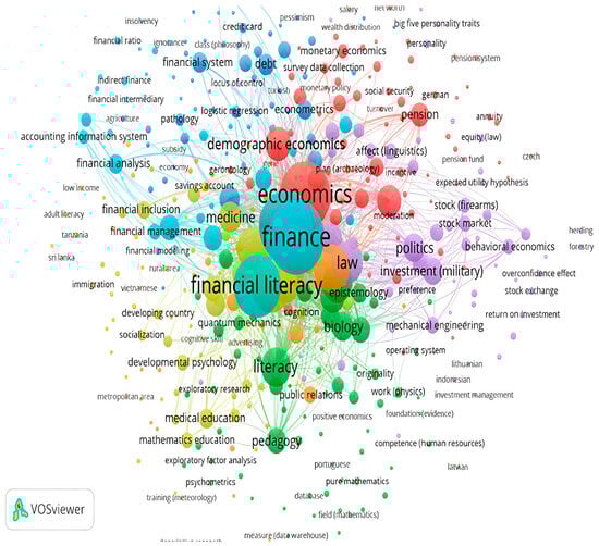 Peripheral clusters: On the map’s periphery, less densely connected clusters are evident. The law and regulation cluster includes terms related to legal and regulatory aspects, such as “law”, “equity (law)”, and “regulation”. This cluster reflects how legal frameworks and regulatory measures impact financial practices. Another peripheral cluster, social and demographic factors, encompasses terms like “gender”, “age”, and “income”. This cluster reveals the intersection of social and demographic variables with financial literacy and behavior.