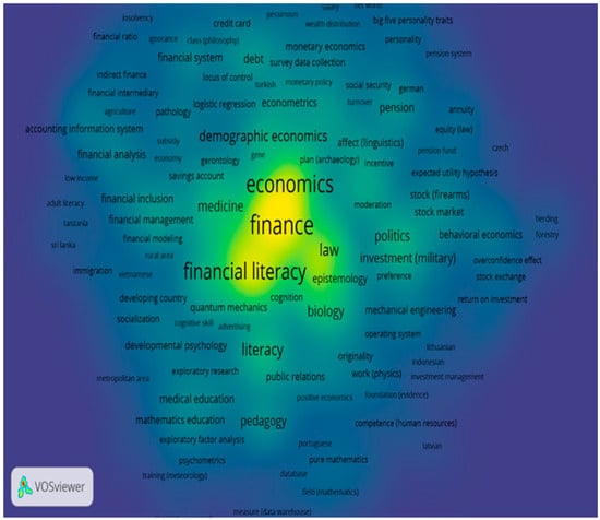 Figure 6 showcases a VOSviewer map that provides a density visualization of the co-occurrence network, offering a detailed perspective on the relationships among frequently co-occurring terms in the realm of financial literacy and gender. The map uses varying color intensities to denote the density of connections between terms, with darker colors indicating a higher concentration of co-occurrence.