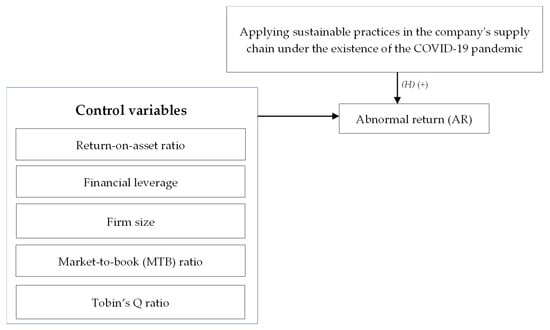 Regardless of the effectiveness of implementing sustainable supply chain management strategies, as previously discussed, companies might quickly restrain their adoption of these strategies in case they have to face new and difficult-to-predict challenges (Amankwah-Amoah, 2020). Previous research pointed out that companies might not continuously maintain momentum for the adoption of sustainability strategies when their financial resources are under severe pressure, as was the case during the COVID-19 outbreak (Fasan et al., 2021). Therefore, as shown in Figure 1, the control variables, which are presented as the financial resource factors, including the return-on-assets (ROA) ratio, company size, financial leverage, Tobin’s Q ratio, and market-to-book (MTB) value, were included in the models to examine their impacts on the abnormal stock returns of companies listed on the market.