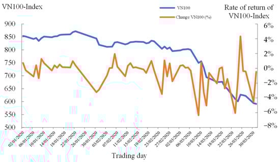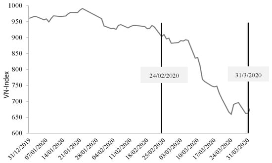 - The period from 24 February 2020 to 31 March 2020 was considered the starting date for when the negative impacts of the COVID-19 pandemic on the economy, society, and global stock markets were first reported (Albuquerque et al., 2020; Fasan et al., 2021; Ramelli & Wagner, 2020). This period was used as an event window to assess the impact of the COVID-19 outbreak and compare the changes in abnormal returns between companies that did and did not implement sustainability strategies during the outbreak. During this period, the VN-Index also experienced a significant decline owing to negative news related to the COVID-19 pandemic, both globally and in Vietnam.