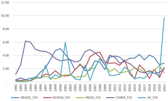 Figure 1 shows that the net FDI inflows for Brazil increased from 0.36% of GDP in 1991 to 1.48% in 1996; this further increased by 2.67 percentage points between 1996 and 2001, before decreasing by 2.16 during the subsequent five-year period (between 2001 and 2006). Brazil’s net FDI inflows in 2011 were 3.92% of GDP and increased to 4.14% in 2016, before plummeting by 1.32 percentage points during the subsequent five-year period, ranging from 2016 to 2021.