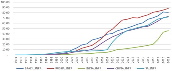 As can be seen from Figure 2, all the five BRICS countries experienced an exponential growth in Internet penetration during the 30-year period ranging from 1991 to 2021. In terms of Internet penetration rate rankings, it is clear from Figure 2 that Russia was the best, followed by Brazil, then China, South Africa, and lastly India.