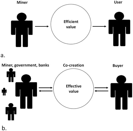 Cryptocurrencies operate according to a simple value-in-exchange model (Figure 2a), where a supplier provides digital currency to a customer in return for payment. Stablecoins, on the other hand, involve the co-creation of value between the buyer and the supplier, thus adding attributes like stability and safety (Figure 2b). Generating stablecoins also requires collaboration among stakeholders (investors, traders, businesses, governments, etc.) and regulatory agencies, thus enhancing their sustainability.