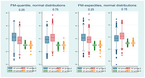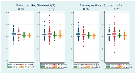 Table 1 presents the estimates computed in two homogeneous subgroups with two estimated β vectors, one for each group. The estimated coefficients do change, both across quartiles and between groups. The relative bias is generally small throughout the table, in both the FM-quantile and FM-expectile estimators, and when the errors are normal or follow a Student t distribution. Comparing these results with those reported in Furno (2023), Table 2, the constant term and the β3 coefficients present much smaller relative biases; the β2 relative bias is slightly larger, although comparable in many experiments, and its dispersion is generally smaller; the Akaike values are now notably smaller. Figure 1 reports the empirical distributions of the slope coefficients of Equation (9), in the experiment with normal distributions in the top graphs and in the case of Student t distributions. The β2 + b2i distributions are more dispersed than the β3 distributions since the latter is not a random coefficient. The Student t experiments are more dispersed than the standard normal ones. In all the experiments of this table, at the first quartile, group 1 overestimates the true value and group 2 underestimates it; the opposite occurs at the top quartile, as can be seen in Figure 1.