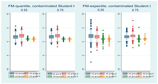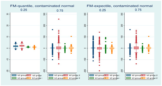 In Table 2, the errors are generated by contaminated distributions. Here, the classes mirror the contamination. The sample is divided in two sub-groups yielding two vectors of estimated coefficients: one vector for the group generated by the central distribution and the other for the data generated by the contaminating distribution. The relative bias in this table is sizably smaller throughout than in Table 4 in Furno (2023) with the sole exception of the β2 expectile results, which are slightly larger. Figure 2 reports the empirical distributions of the slope coefficients from the experiments with contaminated distributions. In this figure, the experiments with standard normal distributions exhibit the greatest dispersion, and the FM-expectile estimates are more dispersed than the FM-quantile results.
