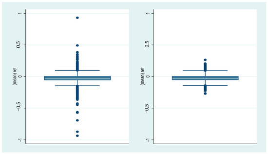 Table 6 collects the estimated regression coefficients computed, respectively, by OLS, median (Koenker, 2005) and robust regression (Huber, 1981). The three estimators present comparable values, not statistically different from one another, with book-to-market not statistically significant throughout. The sole exception is given by the capitalization coefficient, the market value, which is not significant in OLS and is significant elsewhere. This suggests the need for further scrutiny, and possibly some trimming. Instead of defining a subjective trimming criterion, the latter is defined by the robust regression estimator. The latter excludes 58 observations from the sample, anomalous values that are either too small or too large with respect to the bulk of data. The robust regression induces a 1.9% trimming, and the final sample size is n = 2912. Figure 3 compares the box plot of returns before and after trimming, and the impact of trimming is quite evident in the graphs.