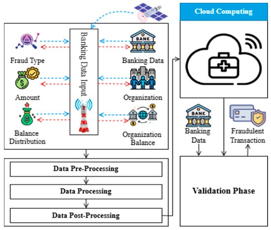 Figure 3 shows the fraud detection pipeline, beginning with banking data acquisition, where key financial attributes such as fraud type, transaction amount, and balance distribution are collected from various banking institutions and organizations. These data undergo a three-stage processing framework: pre-processing (cleaning and structuring data), processing (applying fraud detection techniques), and post-processing (finalizing structured data for validation). The refined data are then sent to the validation phase, where cloud computing infrastructure analyzes and classifies transactions as fraudulent. This cloud-based validation ensures real-time fraud detection, scalability, and accuracy, forming the foundation for an AI-driven, secure financial fraud prevention system.