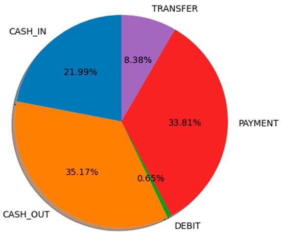 Figure 5 represents a pie chart distribution of different transaction types, visualizing their relative proportions in the dataset. The chart highlights five transaction categories: CASH_OUT (35.17%) and PAYMENT (33.81%) as the most frequent transaction types, followed by CASH_IN (21.99%), TRANSFER (8.38%), and a minor proportion of DEBIT transactions (0.65%). The exploded sections emphasize the variations in transaction volumes, ensuring clear distinction. This visualization helps in identifying transaction patterns, which is crucial for detecting anomalies and fraudulent activities in financial transactions.