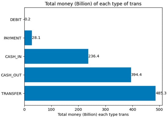 Figure 6 presents a horizontal bar chart displaying the total monetary value (in billions) for each transaction type. The TRANSFER category records the highest transaction volume (USD 485.292 billion), followed by CASH_OUT (USD 394.413 billion) and CASH_IN (USD 236.367 billion). Conversely, PAYMENT transactions account for only USD 28.093 billion, while DEBIT transactions contribute a minimal USD 0.227 billion. This visualization highlights the distribution of financial flow across different transaction types, providing key insights for fraud detection and financial analysis.