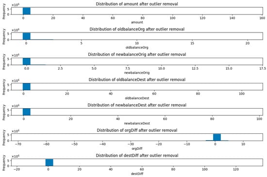 Figure 9 shows an established distribution of the numerical transaction features after the removal of the outliers to gain the best framework for fraud detection. The following histograms represent the cleaned-up distributions of the five financial variables: transaction amount, original balance, destination balance, and balance differences. The IQR method was used in cleaning the data by removing the outliers that may affect the classification of fraud hence making the model more reliable. This preprocessing step is a critical step for better quality of data, more accurate identification of fraud incidences, and fewer false alarms of financial transactions.