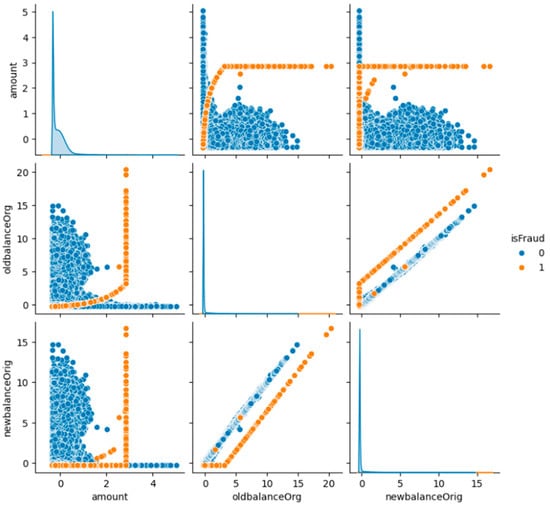 Figure 10 presents a pair plot visualization illustrating the relationships between key financial attributes (transaction amount, old balance, new balance) and their association with fraud detection. The orange points represent fraudulent transactions, while the blue points indicate legitimate transactions. The plot reveals distinct fraud patterns, particularly in old and new balance correlations, where fraudulent transactions often exhibit outlier-like behavior. This visualization helps in identifying fraud-prone data patterns, assisting ML models in distinguishing between fraudulent and non-fraudulent transactions.