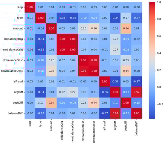 Figure 11 presents a correlation matrix heatmap, illustrating the relationships between key financial features in the dataset. The color scale ranges from blue (negative correlation) to red (positive correlation), highlighting how different attributes influence each other. Strong correlations are observed between oldbalanceOrg and newbalanceOrig, as well as oldbalanceDest and newbalanceDest, indicating expected financial transitions. The ‘isFraud’ feature shows weak correlations with most attributes, suggesting that fraud detection relies on complex patterns rather than direct linear relationships. This heatmap helps in feature selection and understanding dependencies for fraud classification models.