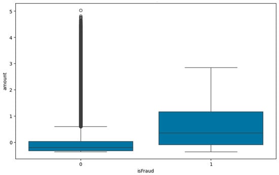 Boxplot of transaction amount distribution for fraudulent and non-fraudulent cases.