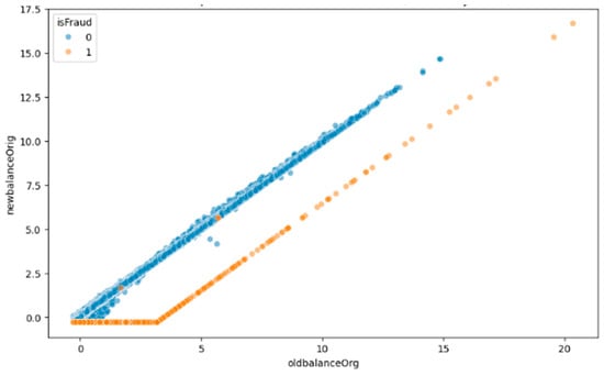 Figure 13 illustrates the relationship between the old balance (x-axis) and new balance (y-axis) of the originating account, distinguishing between fraudulent (1) and legitimate (0) transactions using different colors. Fraudulent transactions (1) are clustered in a distinct lower segment, indicating cases where the new balance remains disproportionately low despite significant old balance values, a common fraud indicator. In contrast, legitimate transactions (0) follow a more linear trend, where the new balance is proportionate to the old balance. This pattern helps in identifying fraud by analyzing balance discrepancies.
