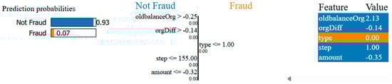 Figure 15 illustrates the explainability of the global model using LIME (Local Interpretable Model-agnostic Explanations) in financial fraud detection. The prediction probabilities indicate that the transaction is classified as “Not Fraud” with a probability of 93% and “Fraud” with only 7% confidence, highlighting the model’s decision boundary. The middle section presents a Decision Tree-like breakdown, where key features such as oldbalanceOrg, orgDiff, transaction type, step, and amount influence the classification. The rightmost table ranks these features by their contribution, showing oldbalanceOrg and transaction type as the most influential factors in determining whether a transaction is fraudulent. This LIME-generated explanation provides transparency into the model’s decision-making, ensuring interpretability and trust in fraud detection.