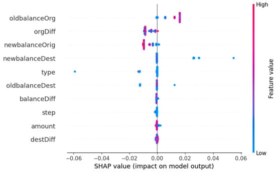 Figure 16 is the SHAP summary plot that illustrates the impact of key features on the global fraud detection model’s predictions. The x-axis represents SHAP values, showing each feature’s contribution to fraud or non-fraud classification, while the y-axis ranks features by importance. OldbalanceOrg, orgDiff, and newbalanceOrig are the most influential factors. The color gradient (blue to red) indicates feature values, with red representing high values and blue having low values. This analysis enhances model transparency, helping identify the most critical fraud indicators.
