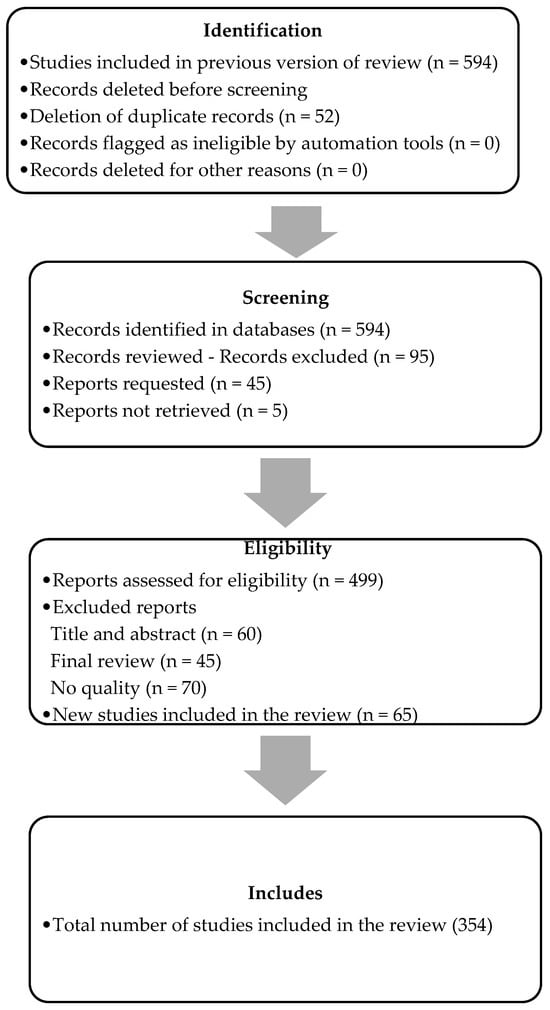 The selection process for the study commenced with a total of 594 studies from the previous version of the review. A total of 52 duplicate records were then removed prior to the screening phase, with no records marked as automatically ineligible or removed for other reasons. Subsequently, 594 records were identified in the databases, encompassing both previous and new studies found in this version of the review. Following an initial review of titles and abstracts, 95 records were excluded, leaving 499 for assessment of eligibility. An additional 45 reports were requested; however, 5 could not be retrieved and were therefore not considered. Subsequently, in the evaluation of the 499 reports, 175 were excluded: 60 were discarded during the title and abstract review, 45 during the final review for not meeting quality or relevance criteria, and 70 more were excluded due to quality issues. This process resulted in the final selection of 324 reports deemed eligible for further consideration. Furthermore, 65 new studies were incorporated, resulting in a total of 354 studies finally included in the review. This rigorous selection process ensures that only the most relevant and high-quality studies are included in the final analysis.