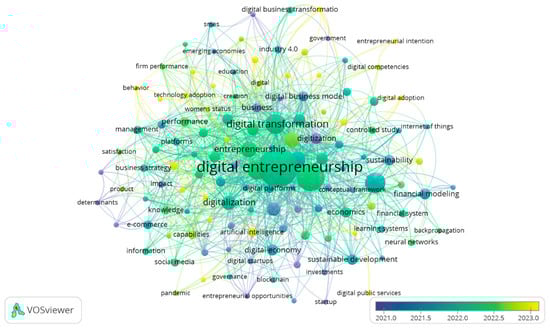 Additionally, terms like “Digital business” (54.217) and “Digital entrepreneurship” (79.983) highlight the integration of business evolution with financial management in the digital age. While “Management” and “Financial management” remain relevant, emerging terms such as “Digital transformation” (0.739), “Technology” (13.175), and “Big data” (57.722) reflect the impact of new technologies on business models. “Risk assessment” and “Decision making” also emerge, emphasizing the importance of risk management in a dynamic environment. Together, these keywords indicate that digital ventures are influenced by technological innovation, sustainability, and the need for adaptability in management models.