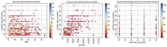 This observation is further supported by the scatterplots in Figure 1, which reveal a lack of visible patterns or trends among the majority of feature combinations. While the “months loan duration” and “amount” pair displays a clear upward trend, neither “age” nor “percent of income” demonstrates a discernible relationship with “months loan duration.” This suggests that, apart from the primary correlated pair, the dataset is largely composed of independent or weakly related features, which may influence model selection and feature engineering strategies.