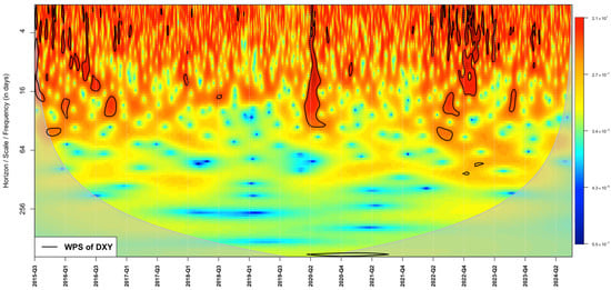 A WPS heatmap of the DXY. The right-hand color bar reflects the intensity of the wavelet power, where warmer shades (e.g., red and yellow) denote heightened volatility, and cooler tones (blue and green) suggest lower volatility levels. The black contours outline statistically significant regions at the 5% confidence level, highlighting time–scale intervals where observed fluctuations stand out relative to expected baseline behavior. These contours are computed using an AR(1) benchmark model for DXY returns, a standard approach in wavelet studies, which aids in distinguishing genuine volatility signals from random noise inherent in autoregressive processes.