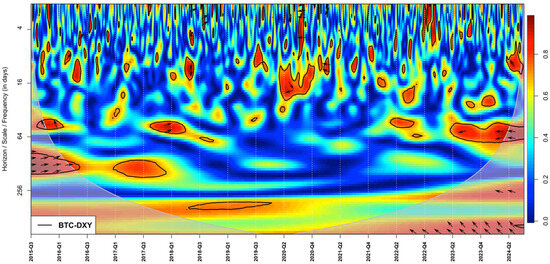 This volatility landscape of the DXY directly addresses how the DXY’s time–frequency characteristics evolve, setting the stage for examining whether BTC’s market behavior remains robust—or “resilient”—amid these dollar movements. By linking the DXY’s observed volatility windows to subsequent wavelet coherence analyses, we can observe whether BTC displays the expected inverse relationship typical of USD-priced assets (i.e., an out-of-phase correlation) or diverges from this norm, thereby offering evidence of resilience properties.